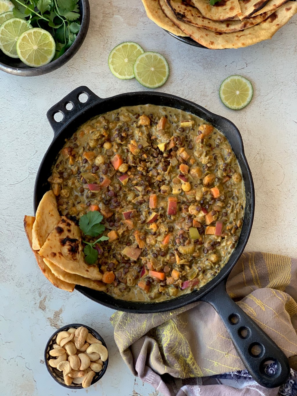 - Garnish with cilantro, lime wedges and cashews as desired.
